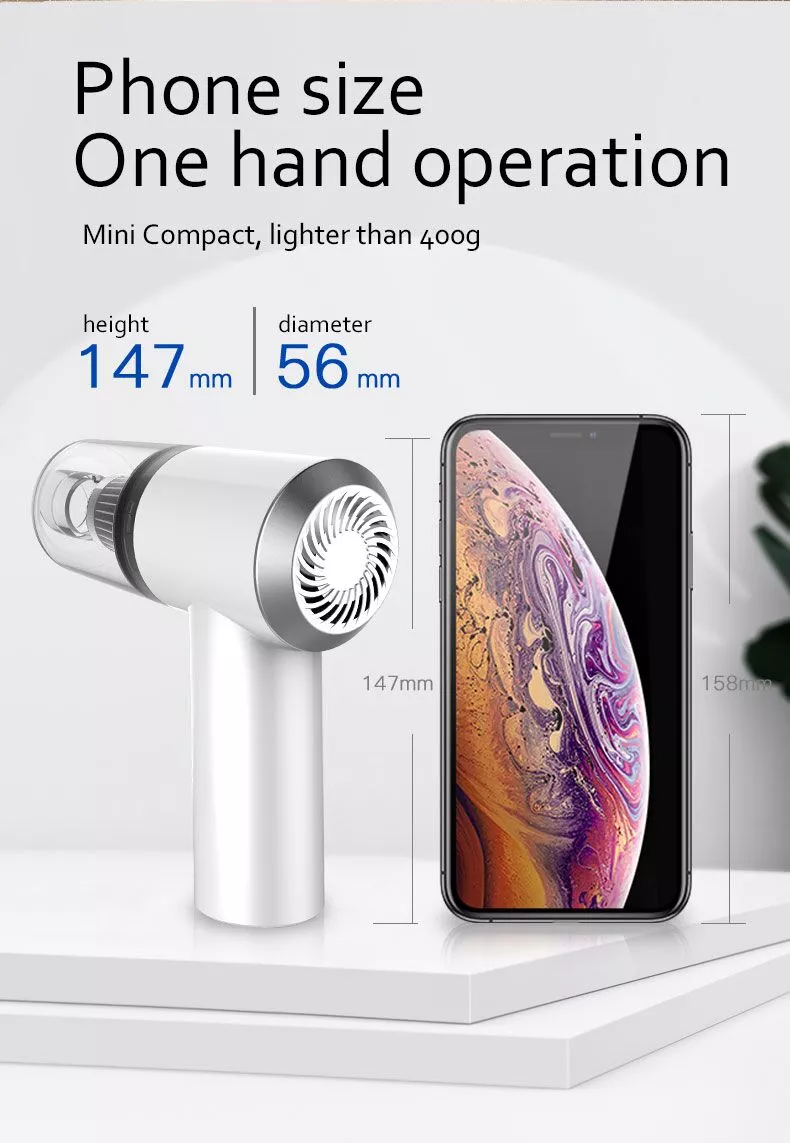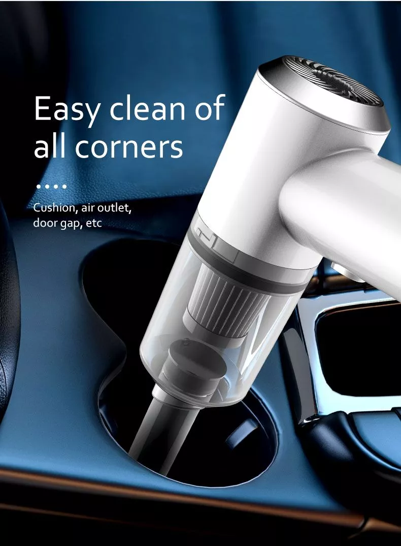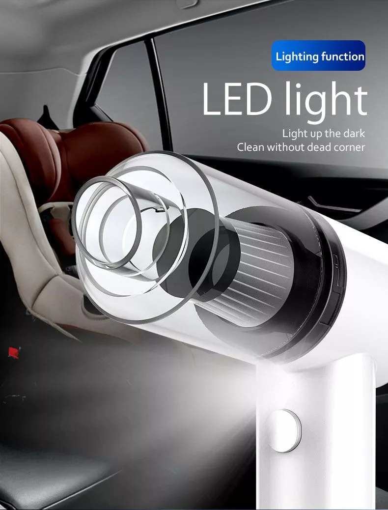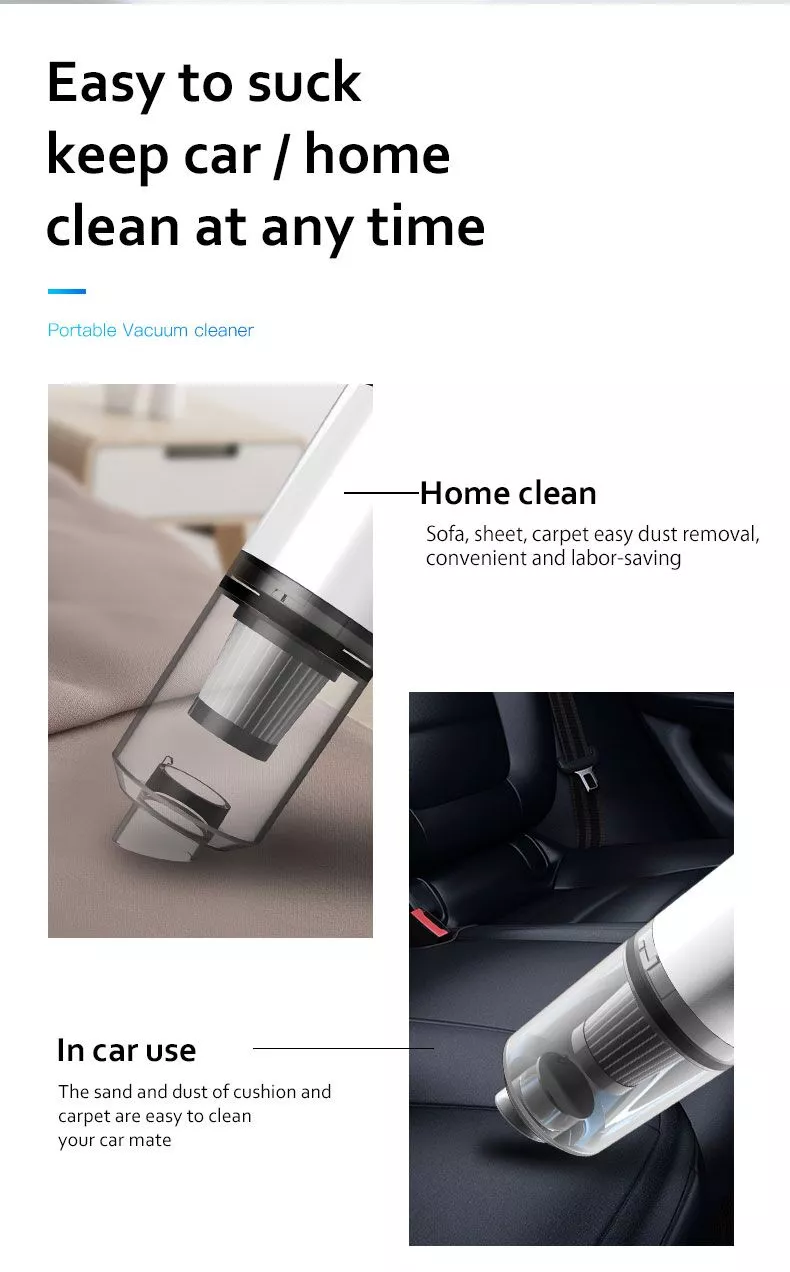 Esta Aspiradora de Mano Portátil Recargable de Limpieza 2 en 1 es práctico de usar. Elimina el polvo, la suciedad, restos de comida, tierra y más en poco tiempo. Con su diseño compacto, portátil y ligero, es fácil de maniobrar y tiene iluminación para que sea fácil aspirar esquinas, grietas y lugares difíciles de acceder. El cubo visualizador es transparente para en saber el momento cuando sea necesario retirar el exceso de polvo. Es ideal para limpiar el hogar, el interior del asiento del carro, el escritorio, teclados, estantes, alfombras, muebles, etc. Es resistente, duradera y conveniente de almacenar. Además, es recargable, se puede conectar directamente al cargador del auto.