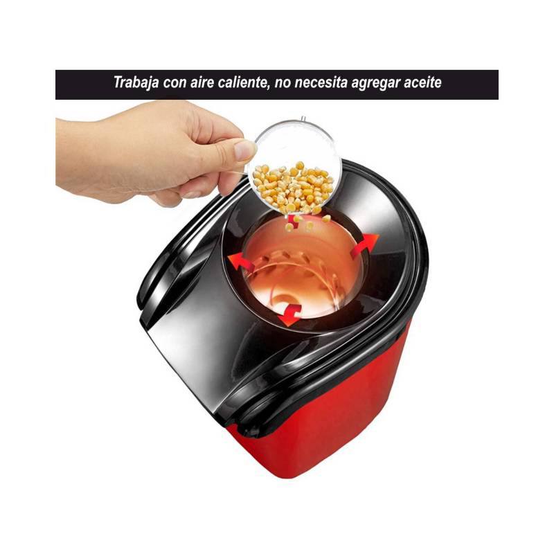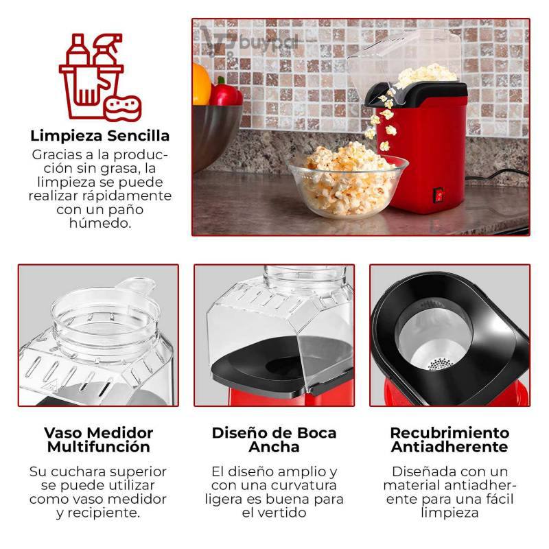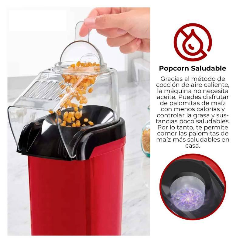 4° Sin aceite: Utiliza aire caliente para hacer estallar los granos de maíz, lo que resulta en palomitas más saludables y con menos calorías que las preparadas con aceite.